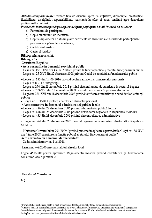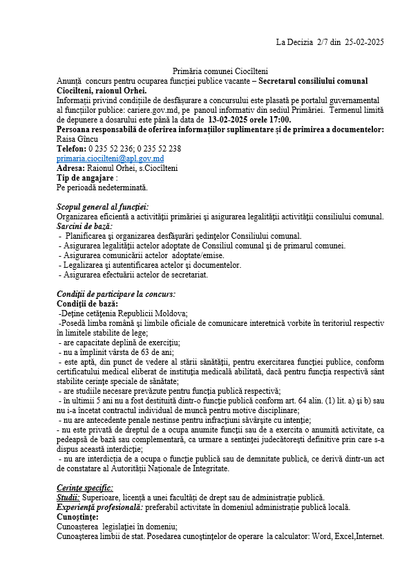 Concurs la funcția de secretar al Consiliului Local Ciocîlteni